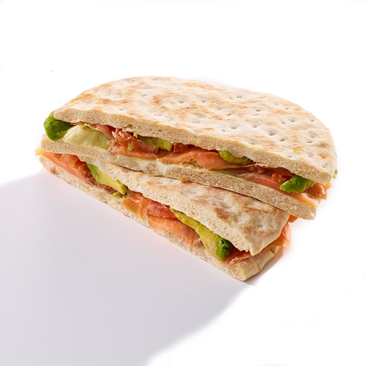 Saint Moret, saumon, avocats, tomates, salade, le tout dans un pain polaire.